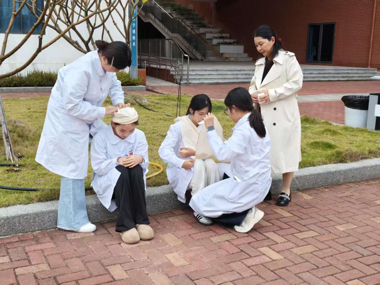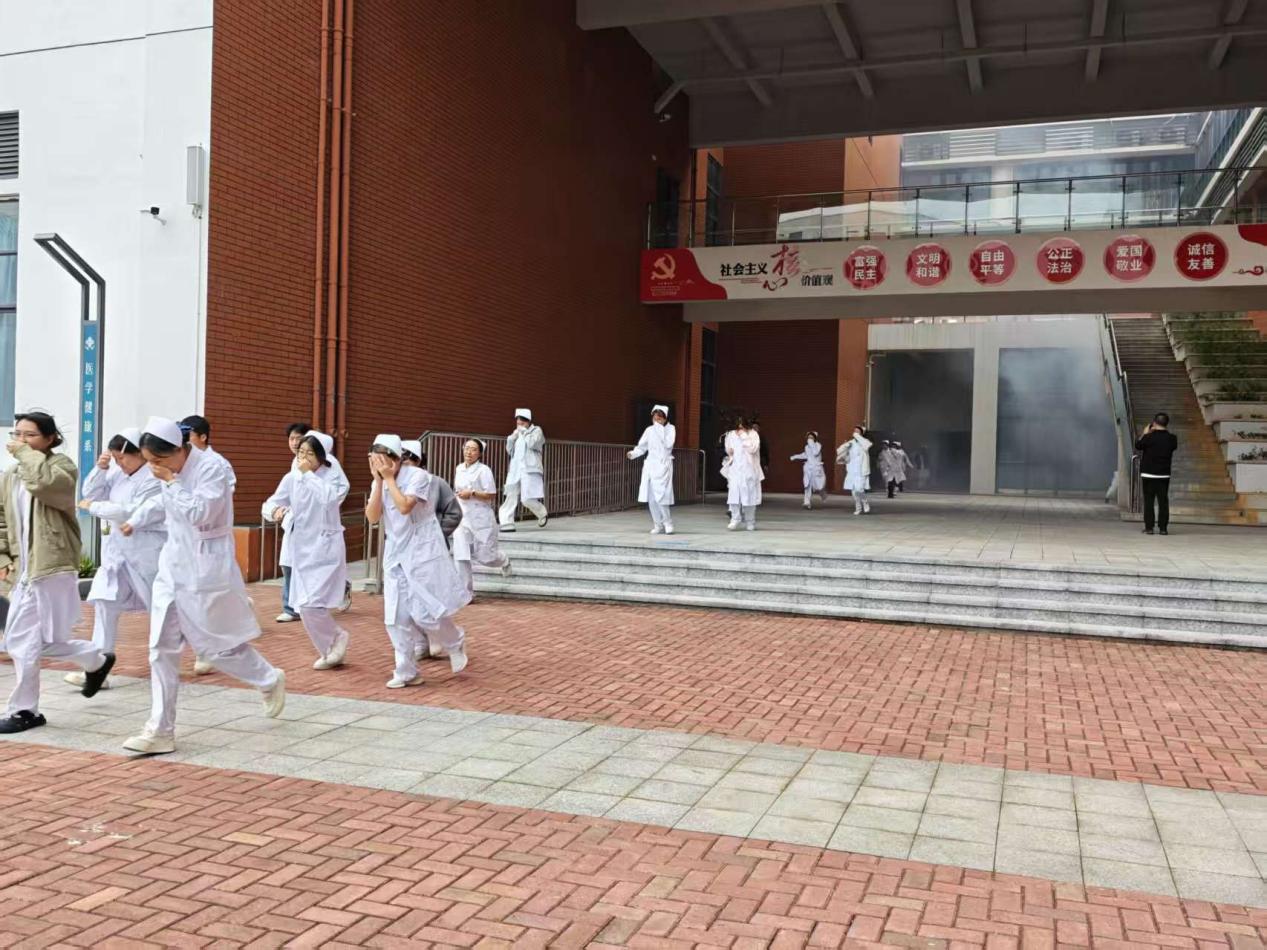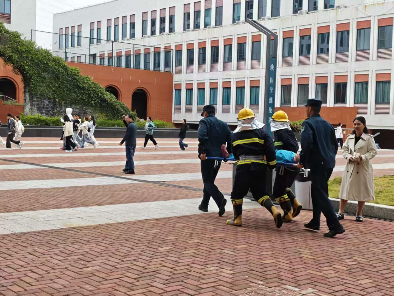 警报响起后,演练正式启动。应急疏散组按预定路线引导师生撤离,师生捂住口鼻、俯首前行,避开拥挤踩踏风险。医疗救护组同步开展人员搜救、伤口包扎、心肺复苏等实操救援,灭火保障组在墨香广场完成初火扑灭展示。
